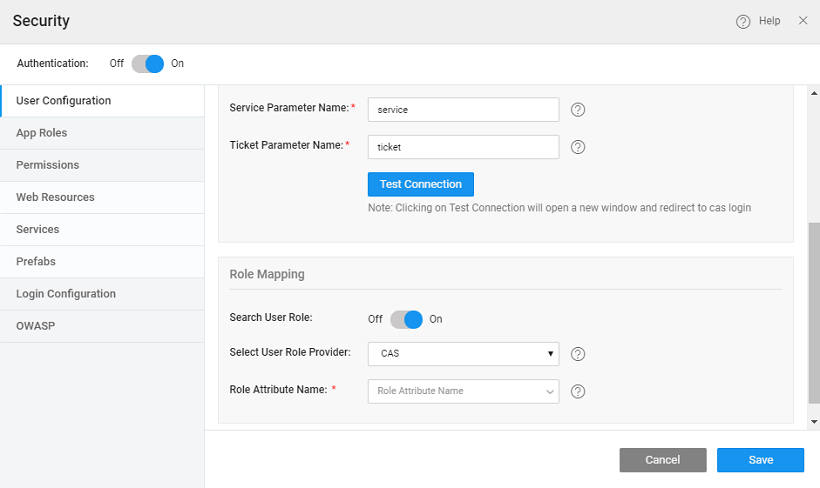 To set up authentication using a Central Authentication Service in WaveMaker apps, enable from the security dialog, choose CAS as the Security Provider.