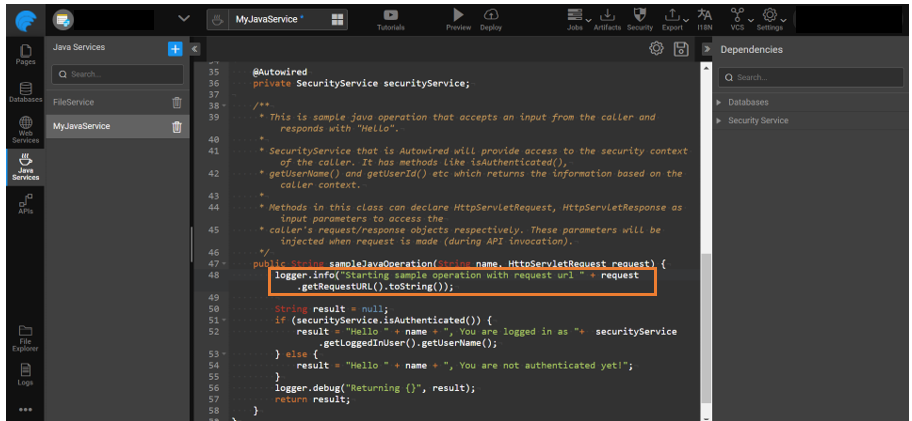 When a Java service is created, it by default has the logger statement in the Java code. But to print a logger statement in a log file, you can make any one of the following changes.