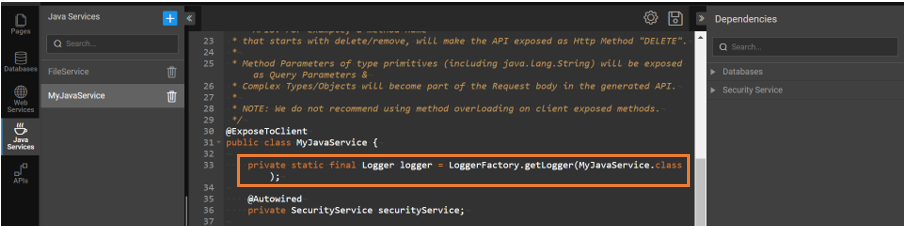 When a Java service is created, it by default has the logger statement in the Java code. But to print a logger statement in a log file, you can make any one of the following changes.
