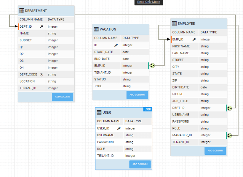 As an example, we are using the following Employee-Department Database Schema (Sample hrdb that can be imported into Studio) with a unique constraint for Dept_code on the department table: