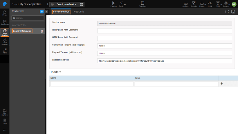 • URL: Toggle WSDL Source to URL and enter the URL of the WSDL, for example: http://www.oorsprong.org/websamples.countryinfo/CountryInfoService.wso?WSDL