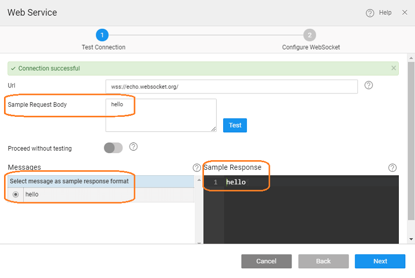 Since WMO is hosted on https, a WebSocket service on ws:// protocol cannot be tested because of security limitations on browsers. To cater this, the platform detects if the URL entered by the user is on ws:// protocol and throws a warning to the user with a message. At this point the TEST button is disabled. You can still proceed, however, by checking the Proceed without Test option. You can check this flag, provide sample Request Body and Sample Response and proceed to config screen without testing.
