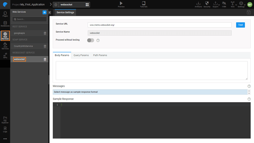 WebSocket Service can be further configured by specifying the Query, Path, and Body Parameters as per the app requirements.