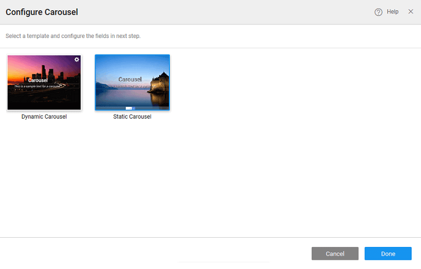 - Dynamic where the Carousel content will take the form of an array or any repeated list like a dataset. The number of items displayed within the carousel will depend upon the number of rows in the bound variable. Carousel Template a subWidget of Carousel holds the slide content.