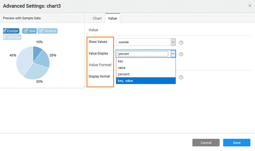 - the Value to be displayed - as key, value, percent (default) or key-value pair