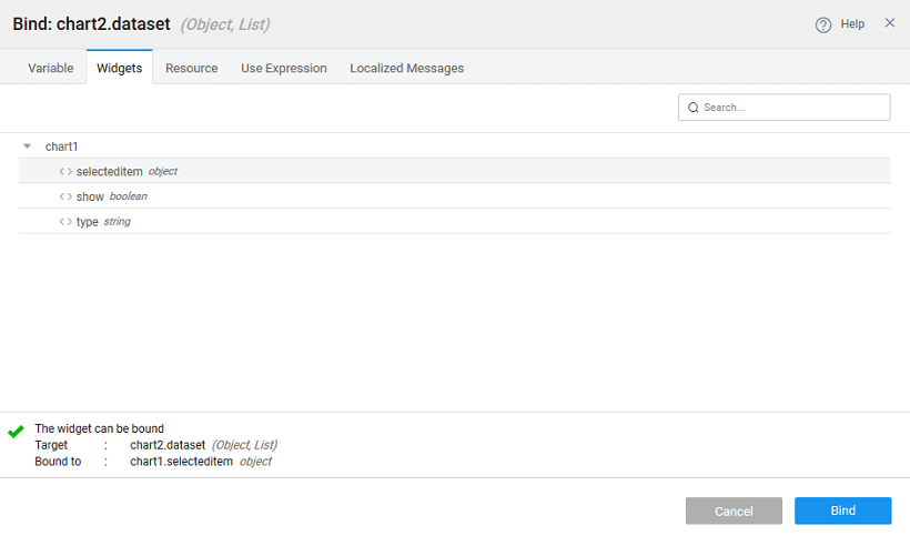 - The various outbound properties of a chart are available for binding to other widgets or variables. The fields under selecteditem will be from the underlying dataset used for binding.