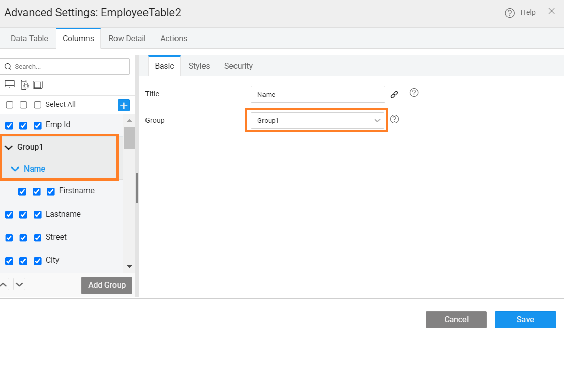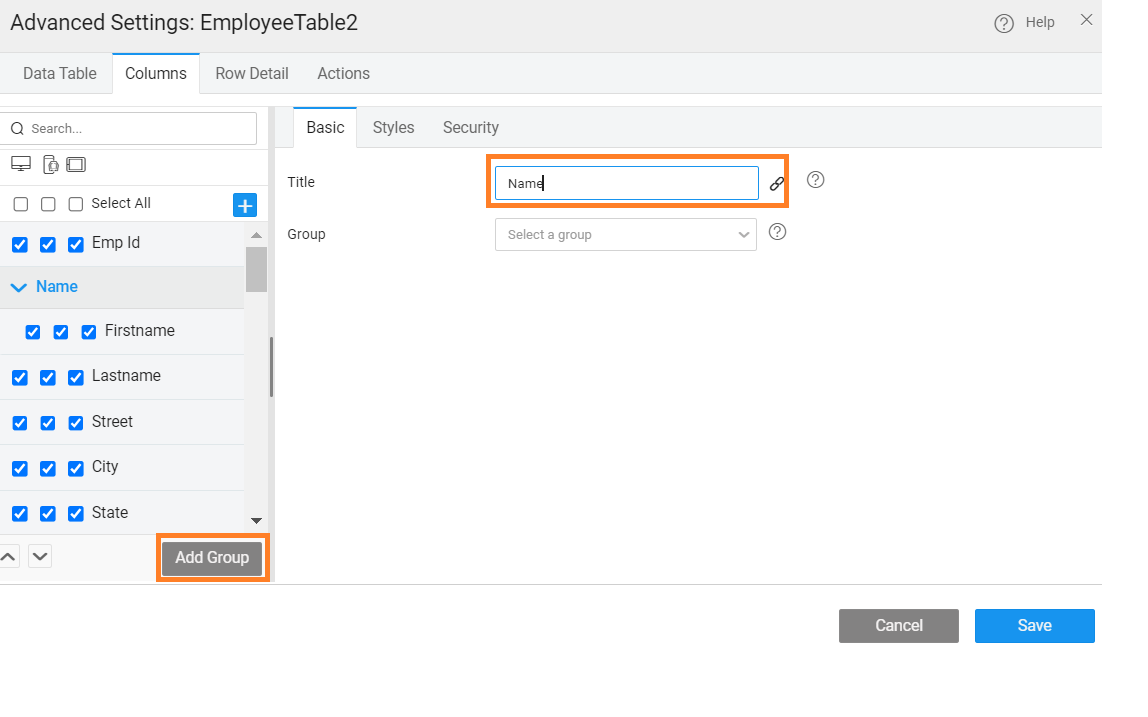 • Value Expression - You can write a custom expression to change the display setting for a table column. The expression needs to follow AngularJS conventions for binding. A sample expression is given which can be enhanced as per the needs of the application.