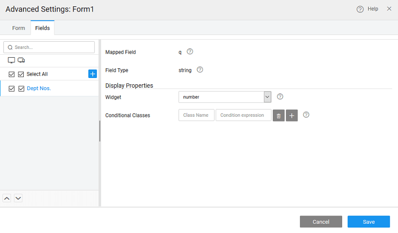 • Dataset Value defines the Web service API or database API on which the insert or update operations will be performed. This is set to the Variable selected in the data selection step while configuring the Form