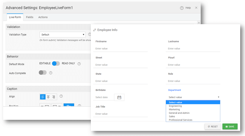 Live Form widget provides a columnar group of input elements for user entry. Live Form can be bound to a database through Database CRUD variables and can be used to perform CRUD operations on the underlying database via REST API call. These CRUD APIs are auto-generated at the time of Database Integration.