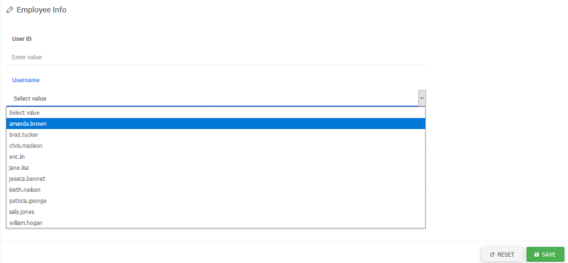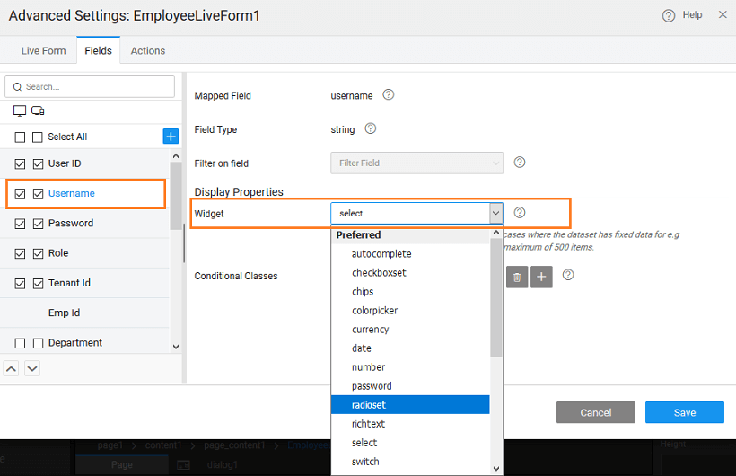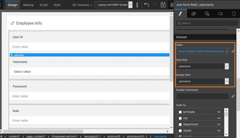 - The dataset for the form field widget is auto populated with the Variable Dataset field. Data field and display field is set to field’s key. Here, the dataset value can be bound to any other variable or widget.
