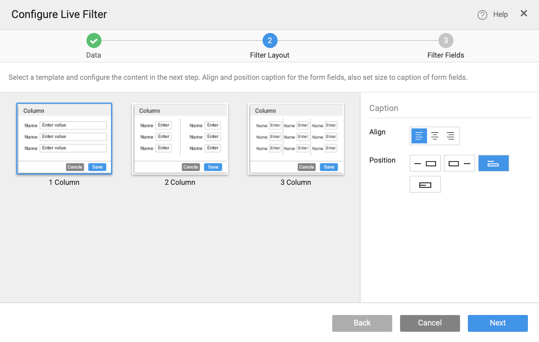 Live Filter layout can be 1-column, 2-column or 3-column. Apart from this, the alignment of a caption for the fields can be configured to be placed on top, left, right or floating of the filter fields.