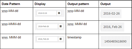 | Date Pattern | Date pattern lets you override how dates are displayed. Common options are 'dd-MMMM-yyyy', 'yyyy/MM/dd'. |