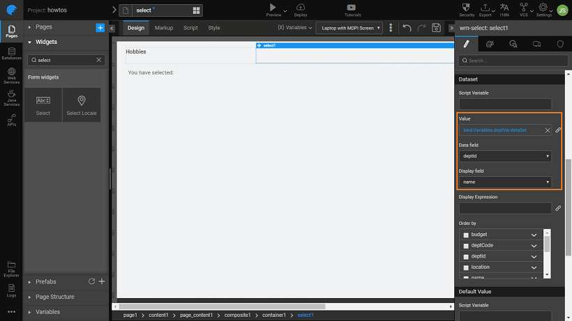 3. Set the Datafield property to the deptid field and Display Field property to the name field of the Live Variable corresponding to Department dataset