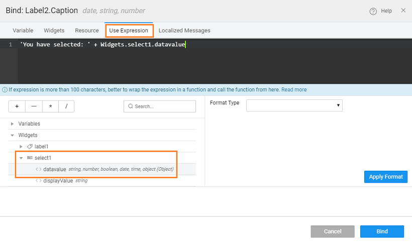 4. The selection made by the user is displayed in a Label widget, by binding the select datavalue to it.
