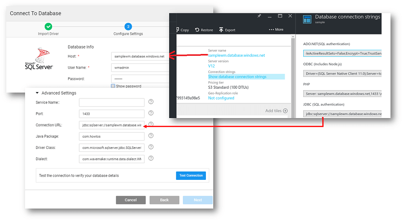 - Provide Azure SQL server details such as Host, User Name, Password and Database Name, Schema Filter (comma-separated list of schema names to import) in the configure settings step and click on ADVANCED SETTINGS button to review the generated connection url. Note: The mappings between the Azure MS SQL Server and WaveMaker are given in the next section.