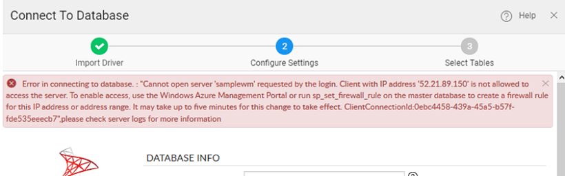 - Once connection has been successfully established you will be provided with a connection success message and Next button will be enabled. In case you get an error message, check the Firewall settings at Azure as explained here.