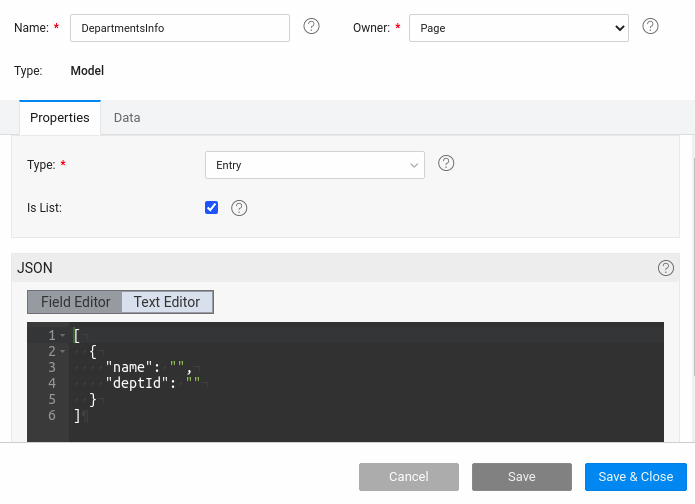 Variables.DepartmentsInfo.dataSet[$i].name.Set the Content property of the Tab Pane to the Partial page created in Step-2 by binding the deptId to