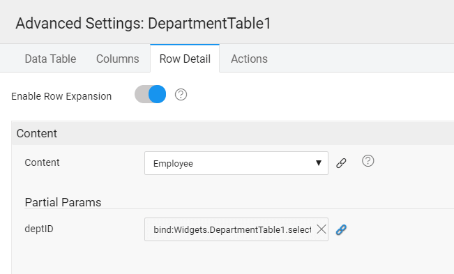 deptID fills with: bind:Widgets.DepartmentTable1.selecteditem.deptId
