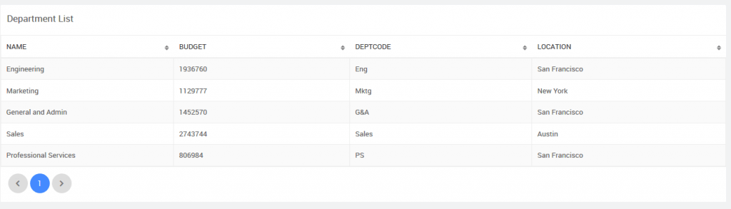 - Drag and drop Data Table widget, and set the source of data to variable created from department entity. We have chosen Read-only. Simple View template for this example.
