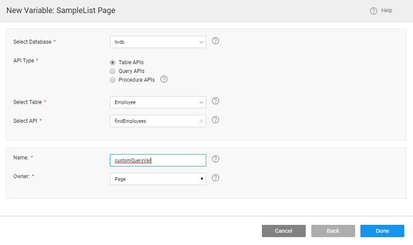 Create a Database API Variable named customQueryVar for the page created in previous step and set