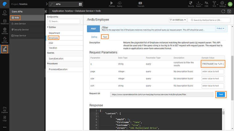 Notice in Data tab of the Service Variable q Input Field. This will be used to construct the dynamic where clause on Employee for findEmployees method.