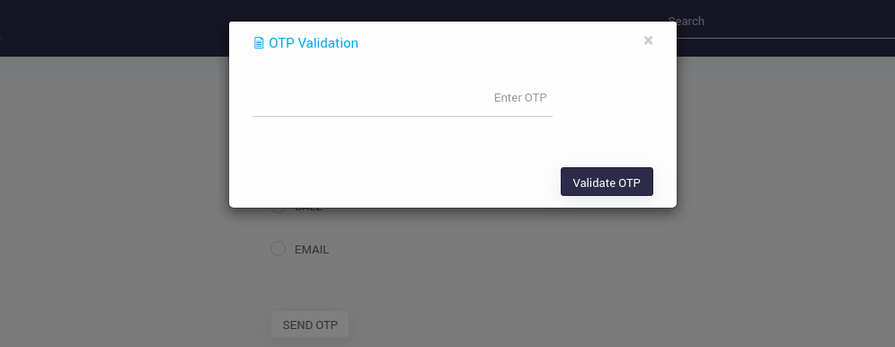 - Now preview the app, enter login credentials in Login page. Once authentication is successful, it will be redirected to OTPPage. Enter phoneNumber or email and select the channel and then click on Send OTP button. A dialog will be popped up to validate OTP. Once OTP is validated you will be redirected to user landing page.