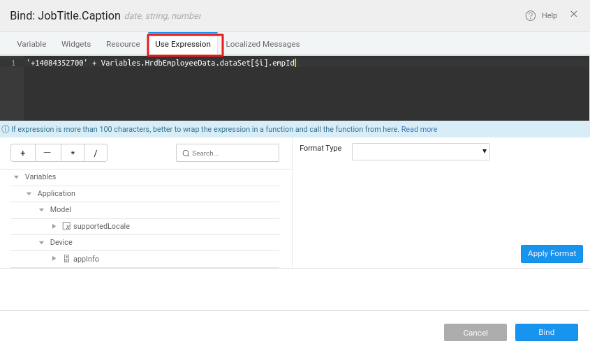 1. From the canvas select JobTitle label widget, using the bind icon next to its Caption property, from the Use Expression dialog bind it as specified below.