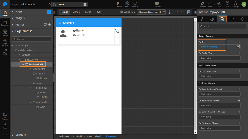 An application has to be built to list the phone numbers of employees in an organization. The user should be able to call directly from the app. For the database, we will be using the sample HR database that is available in WaveMaker.
