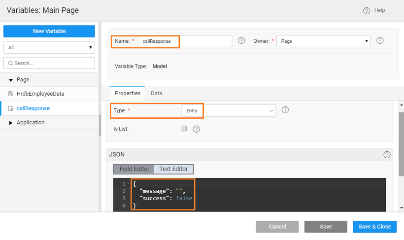1. Create a Model Variable called callResponse that will hold the plugin's response. callResponse is of entry type with message and success as its properties. Giving default values will help in identifying the type of the property. For example, success has false as the default value. From that, it can be inferred that success is of boolean type.
