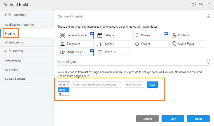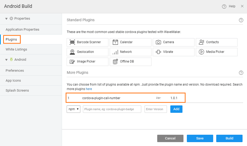 There might be a case when this list of plugins provided by default falls short of the app requirements. You might be required to use additional Cordova plugins. This document explains how to add Cordova plugins to a WaveMaker mobile application.
