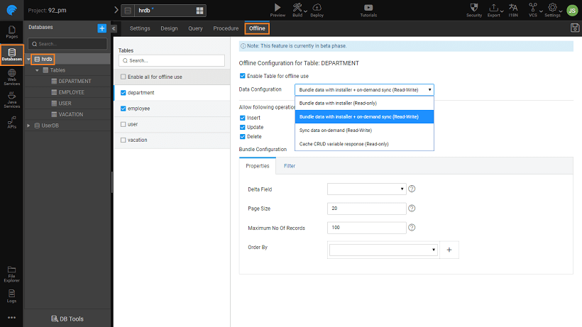 14. If a table has to be available in offline, select the table and then check the flag ‘Enable data storage when device is offline'.