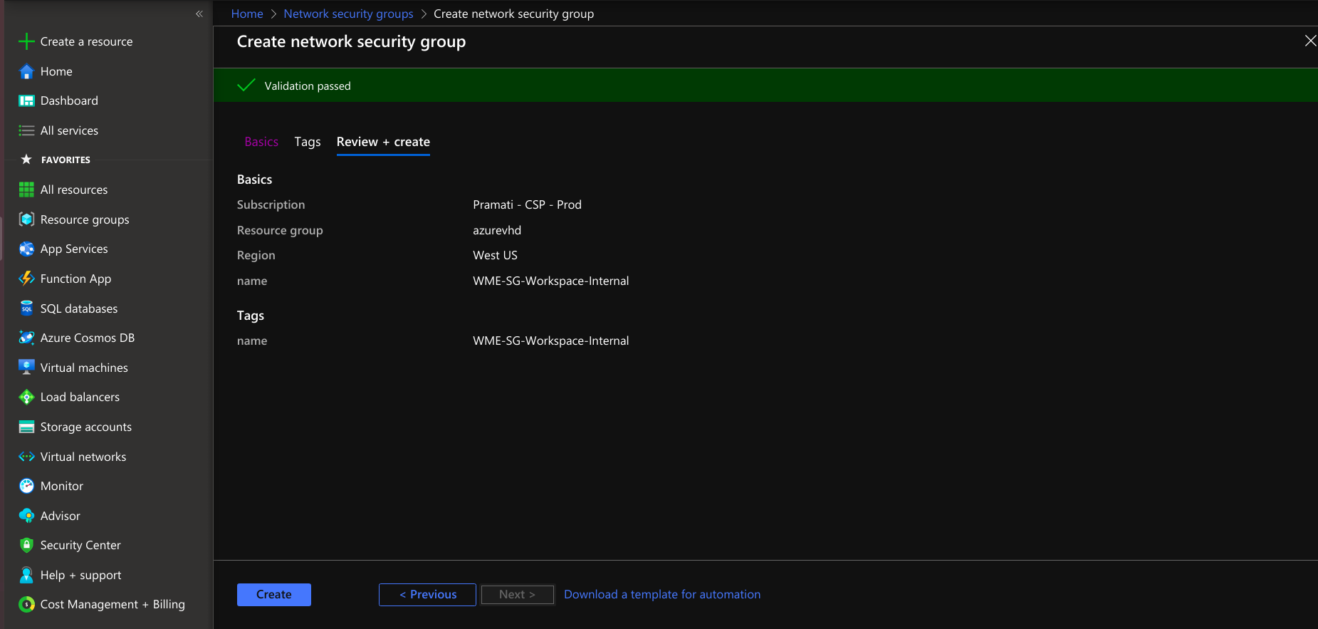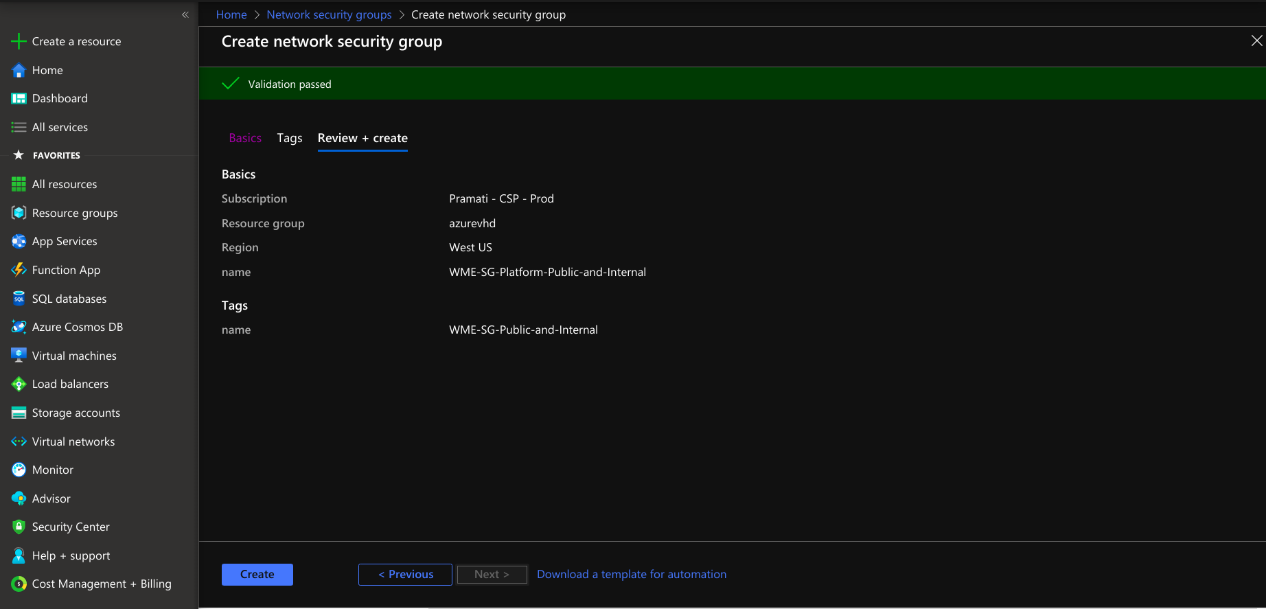 Creating network security group for platform virtual machine