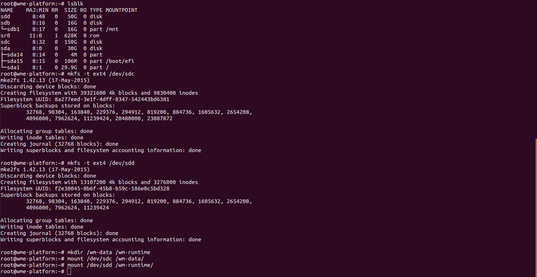 mkdircommand to create a mount point directory for the volume. The mount point is where the volume is located in the file system tree and where you read and write files after you mount the volume. For WME-Setup, create two directories using the following commands.