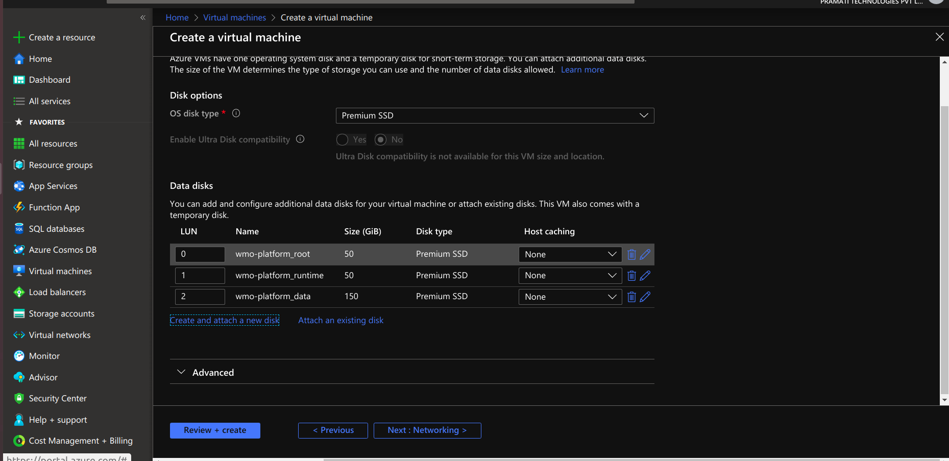 - At disk section create 2 disks one for wm-runtime and another for wm-data with 50 and 150 GB size.if you want any additional disk you can add.