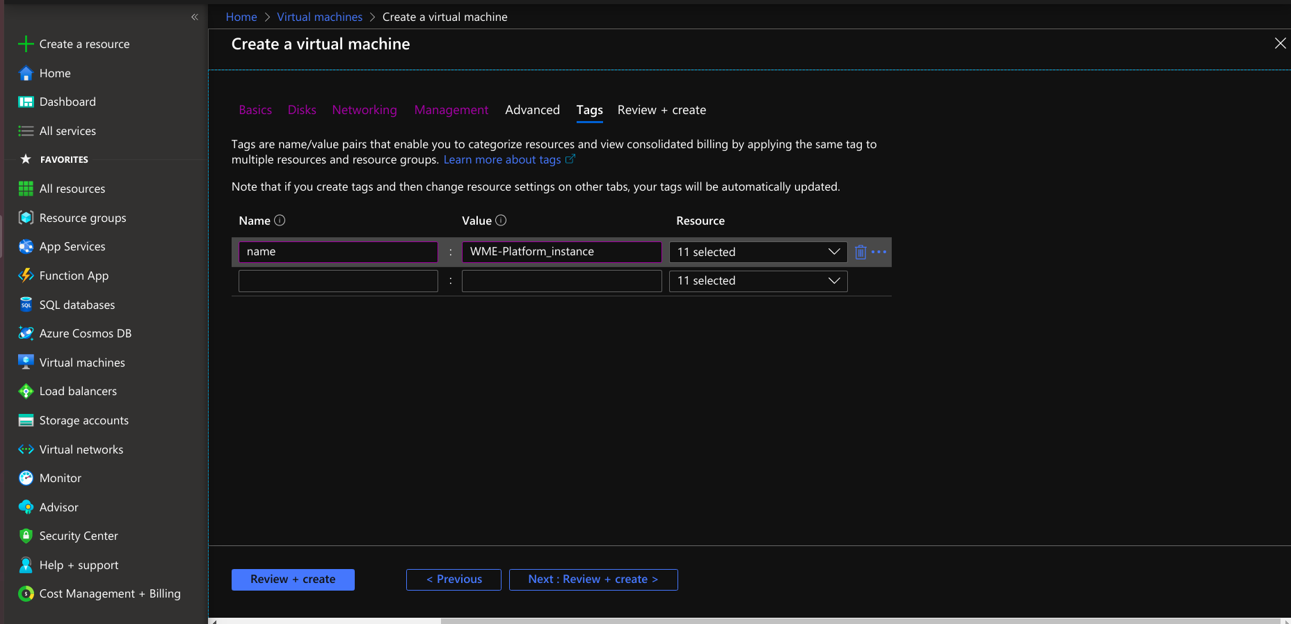 - Provide tags that are name-value pairs for the virtual machine for categorizing the resources.