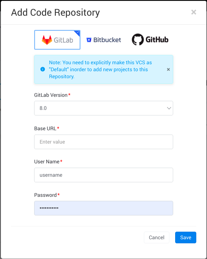 After selecting Add Code Repository, select the repository type and provide the required details for adding the repository. As default providers, WaveMaker supports Gitlab, Bitbucket, and Github for external VCS configuration.