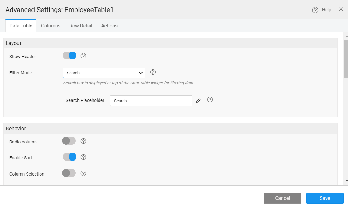 Access to the following features from the Advanced Settings property of a Data Table.