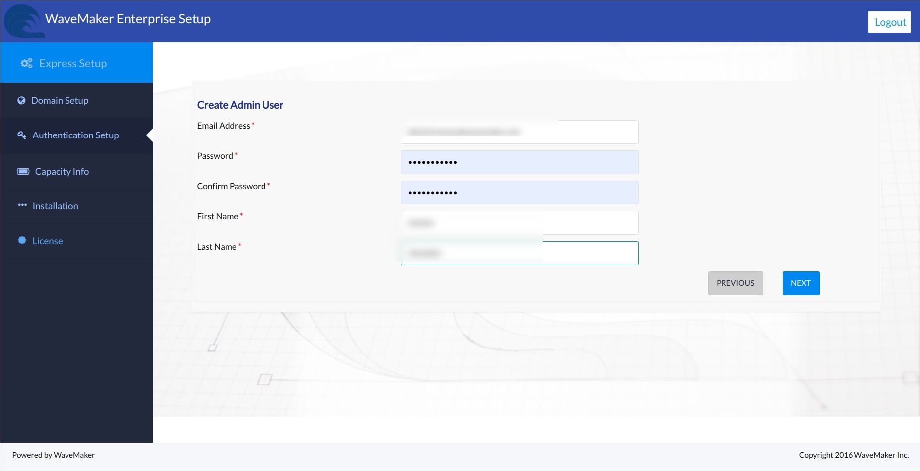 Create an admin user for WaveMaker launchpad access by providing an email address and password. These credentials are used to access launchpad and do adminstration of WME setup like adding users, setting up vcs, adding capacity etc.